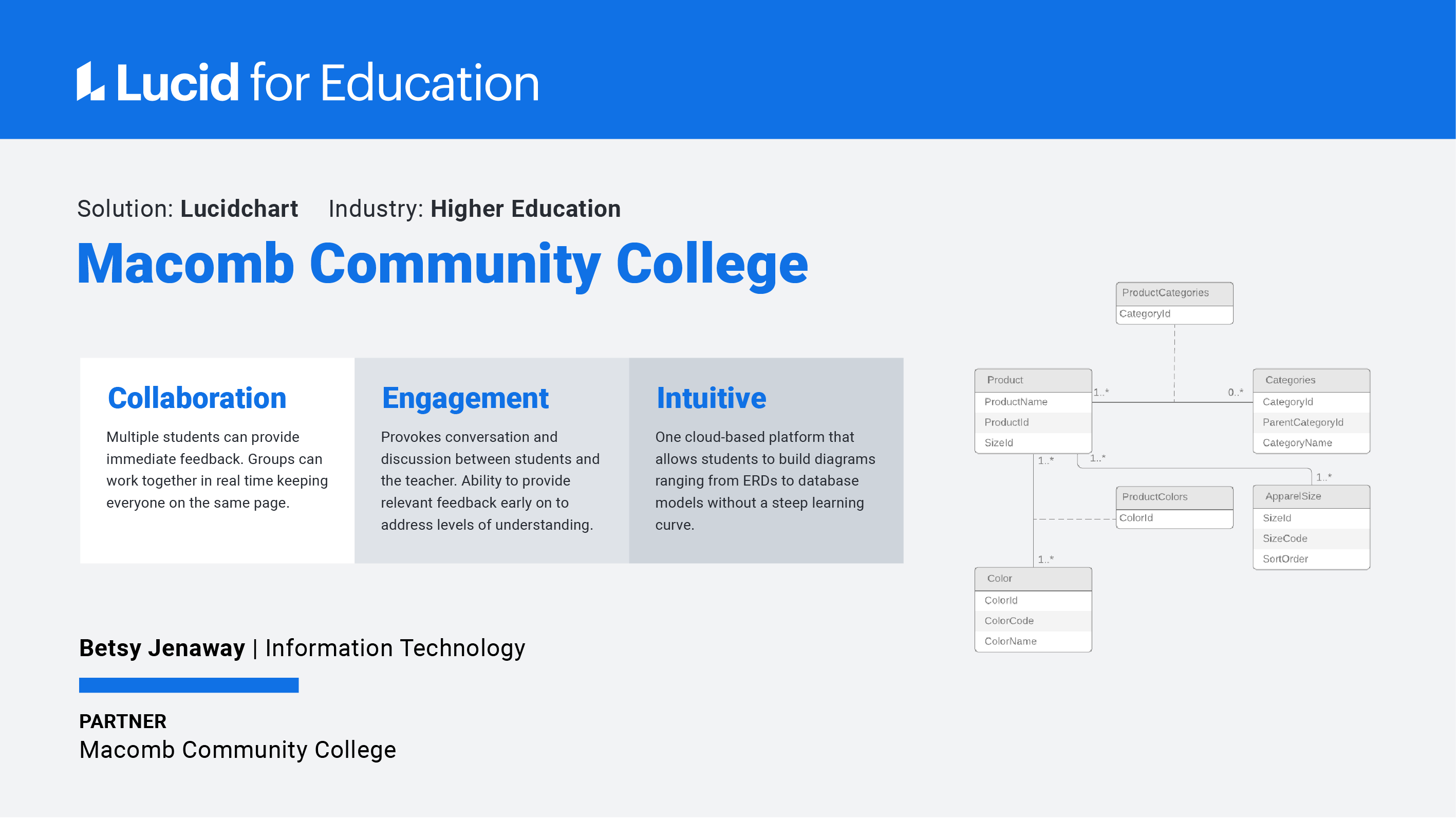 Macomb Community College sought a more intuitive platform to introduce students to programming, one that could support both entry-level students and upperclassmen. They needed a tool that would streamline collaboration, both in class and online. Lucid for Education provided the solution with its cloud-based diagramming and schema tools, integrated directly into their LMS, simplifying grading processes.